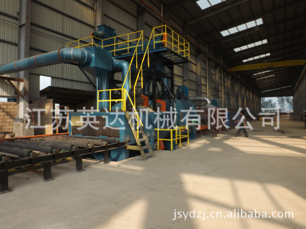 板材預(yù)處理線 型材預(yù)處理線為連續(xù)送料的高功能連續(xù)作業(yè)清理,在清理過程中由電氣控制的變頻電機驅(qū)動輥道將工件送進清理機室體內(nèi)拋射區(qū)時,其周身各面受到來自不同坐標(biāo)方位的強力密集彈丸的打擊與磨擦,使工件上的氧化皮及其污物迅速脫落,工件表面獲得粗糙度的光潔表面。落入工件上面的彈丸與銹塵經(jīng)回收螺旋輸送到彈丸循環(huán)系統(tǒng),由清理室外兩邊裝卸工件。清理過程中,撒落下來的丸塵混合物經(jīng)室體漏斗、縱橫向螺旋輸送機匯集于提升機下部,再提升到機器上部的分離器里,分離后的純凈彈丸落入分離器料斗中,供拋丸循環(huán)使用。拋丸清理過程中產(chǎn)生的塵埃由抽風(fēng)管送向除塵系統(tǒng),凈化處理后的凈氣排放到大氣中,顆粒狀塵埃被捕捉收集。
