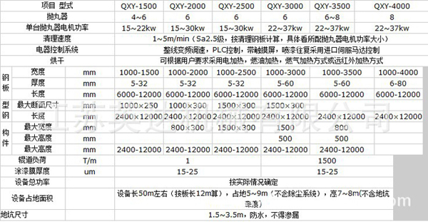 QXY鋼板預(yù)處理線主要部件由清理室,輥道輸送機(jī)、拋丸器、彈丸循環(huán)系統(tǒng)(含提升機(jī)、分離器、縱向螺旋輸送器和供丸管道)、除塵、清掃、電氣控制等部件組成。